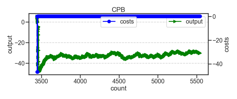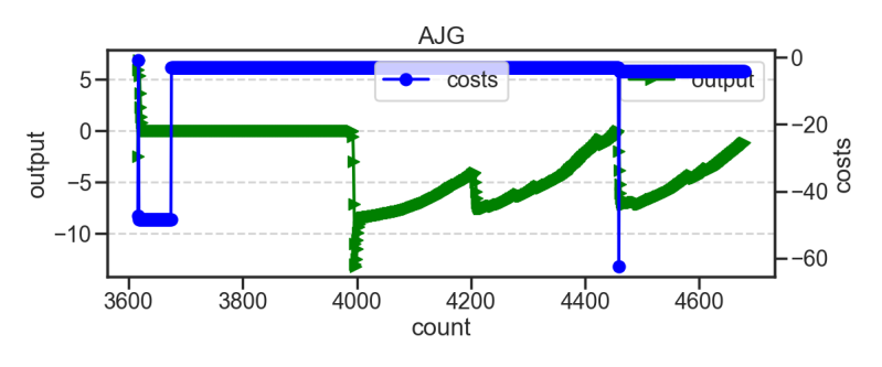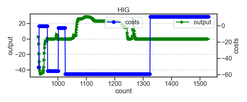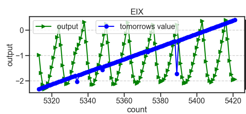 The network looks to maximise its trading opportunity and I doubt you could find a better trading method than the below for this circumstances the values peaked just above 0 and buy the stock often coinciding with the few market falls that take place and hold it a few days before selling it off. at a profit.
